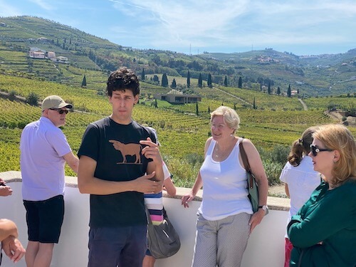 We had a leisurely start to Saturday with our rendezvous at the bus being midday. We headed back to Regua and the family owned estate of Quinta de Tourais. This is another small, family domaine with 14 hectares of vineyards and both a conventional and non conventional approach to winemaking. The family are totally involved in the visit and lunch with Manuela, Liliana, Fernando and Antonio all playing their parts. Youngest family member Antonio welcomed us and took us round the small, traditional winery with old concrete lagares before heading onto the balcony for an overview of the vineyards.