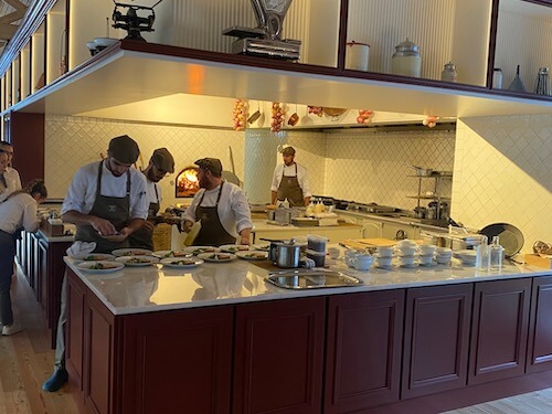 The dining room is wonderfully elegant with fabulous views over the river and an open plan kitchen with all the staff all bedecked with very stylish uniforms.