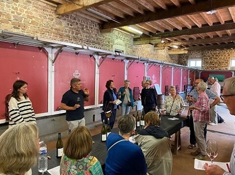 Into the cellar and we witnessed some traditional cement tanks before settling into our tasting. It was a truly wonderful array of wines with a white (labelled as Beaujolais Villages), a Beaujolais Villages red and then four contrasting Fleuries. The quality was stunning and we noted just how good the 2018 vintage was – producing wonderfully rich and fruity wines.