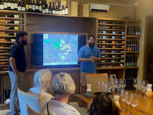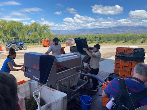 Harvest was in full swing so we saw grapes arriving, the pumps and press in action and met Juanpi – one of the winemakers. You can feel the buzz in the winery at times like this. Emiliano then took us through a terrific presentation of the Uco Valley, focussing on the terroir, altitude, water rights and wind flow. It brought the region to life and was highly instructive.