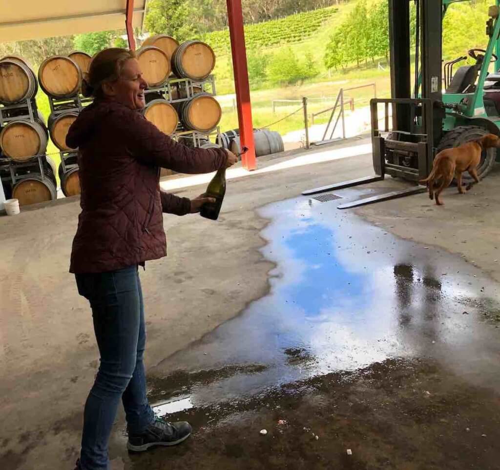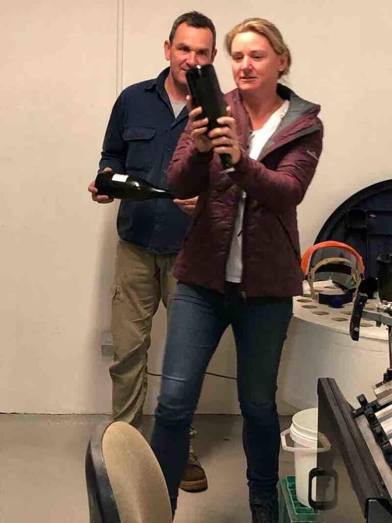 Leave we did and found ourselves at Deviation Road winery – specialists in sparkling wine production. Owner Kate Laurie gave us a short talk in the winery and then demonstrated a manual disgorgement – a first for many!