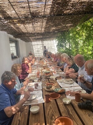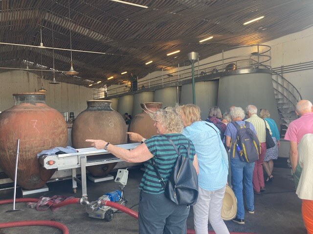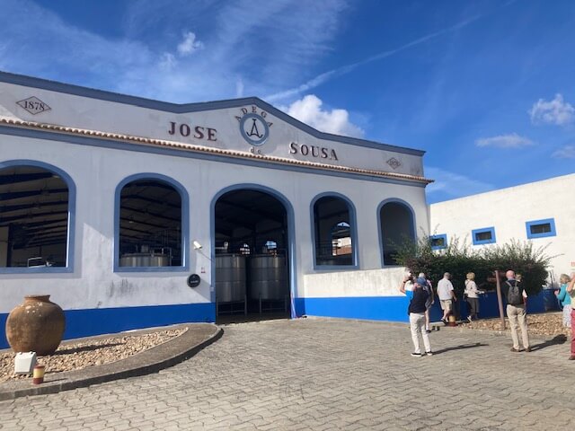 Back up in above ground, we enjoyed a tasting of a variety of their wines, aided by the chief winemaker Josep, who described how their Talha winemaking has involved trial and error as there was no instruction manual back in 1986 when Fonseca acquired the abandoned winery. By 2015 Josep felt they had got it right, and that was lucky as we tasted their Talha red from 2015 and their white from 2016. Both were very different from the other wines we have been tasting. As would be expected from wines that have matured with exposure to oxygen (through the porous clay), they were faded, the red wine to a pale rust, the white to almost tawny port brown. In the process their alcohol levels have dropped through evaporation, and they have developed really evolved flavours such as fruit cake. I don’t think many of us became instant ‘fans’ of these wines (which are relatively expensive), but it was incredibly interesting to taste them and to get a sense of the passion and effort that has gone into rescuing an ancient tradition of winemaking. Talha wines are included in the blends of their superior ‘normal’ red wines, and the Jose de Sousa Mayor from 2018 was a beautiful complex wine with lovely tannins.