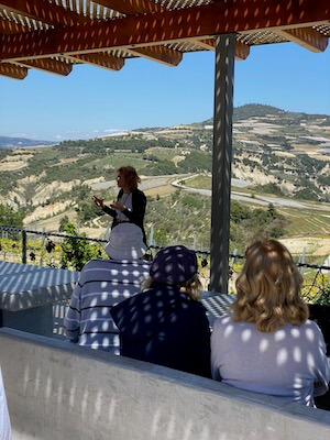 From Palivos it was a half hour drive further up into the hills of Nemea and to the amazing Semeli estate. It is an extraordinary building with a hi tech, modern gravity fed winery, stunning barrel cellar, beautiful reception areas and a lovely restaurant. Hosted by Maria, Margarita and Iannis, we took a walk outside to take in the magnificent views over the valley and see at first hand the winery operations and cellar. We then headed up to the magnificent reception area where we tasted through six contrasting wines: Moschofilero and a Chardonnay/Malagouzia blend, two very different roses and three reds made from Agiorgitiko culminating in the 2003 – an incredible opportunity to taste the very first vintage of the estate. This really proved the ageing ability and quality of this grape.