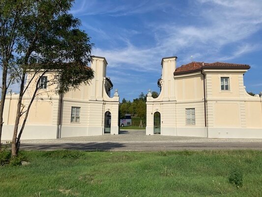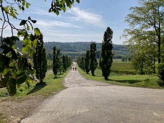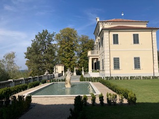 In Basaluzzo our coach driver negotiatied the ludicrously tight corner that seems to be compulsory on Tim’s tours, and beyond the landscape became more undulating, with vines on hillsides.  Soon after the Gavi commune signpost we arrived at some fabulous neoclassical gateposts, which were not going to allow our coach through.. Luckily we were able to nip round them, and up the drive way  lined with very sculptured oak trees to the even more fabulous neoclassical villa at the top of the hill..