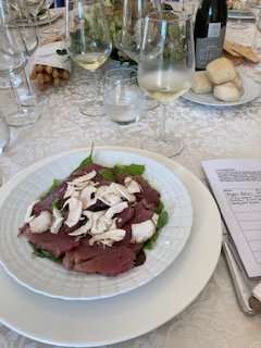 Back at the villa we enjoyed a glass of Method Traditional Gavi di Gavi, made by Magda Pedrini.  From the 2014 vintage it was disgorged (“shoccatura” in Italian) in 2023, and the nine years on the lees had added wonderful creamy hints of brioche to the fresh white flowers and apple flavours typical of the Cortese grape.   We then embarked on a delicious lunch, starting with a beautifully marinated beef carpaccio, with which we had the current vintage of their two Gavis, the Montessora from the vineyard we had visited and the Lugarara from a vineyard with blue grey marl and sandy soil.  The difference was very clear, the Lugarara was lighter and more floral, while the Montessora was more minerally, and the 2018 Montessora that we also drank was far more evolved and complex – proof that top Gavi is really worth laying down for a few years.