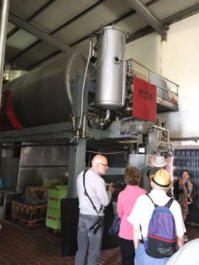 We started with a fabulous explanation of red wine making from Luisa (who is Ceuso’s export manager), with interjections in Italian from Giuseppe. Temperature control, throughout fermentation and during maturation, is key, but achieved through two very different approaches. During vinification stainless steel and heat exchange is key to keeping temperatures right. However, once the wine is made stainless steel is no longer right and the wine is kept in large cement vats (lined with resin). This is for two reasons – cement vats do not require artificial cooling as they are built to be insulated, but for the first time ever on a tour we learnt about the galvanic effect set up by different metals exposed by welds in a stainless steel tank. This creates slight currents and therefore movement of wine, which needs to be avoided – as Ceuso red wines are not filtered, the time spent in cement enables all sediments remaining after fermentation to settle to the bottom, and occasional racking (removing the wine from a tank, leaving the sediments behind) ensures that by the time wines are bottled, the wines are naturally clean and ready to drink. The idea of keeping the wine ‘calm’ appealed to us!