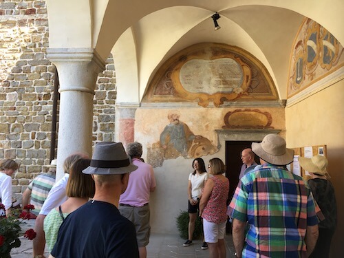We walked through the cloister, admired the church with its frescoes, and went out onto the terrace which had magnificent eastward views to the Goriska area of Slovenia (where some of had been just over a year ago) in the north, and Trieste in the south.