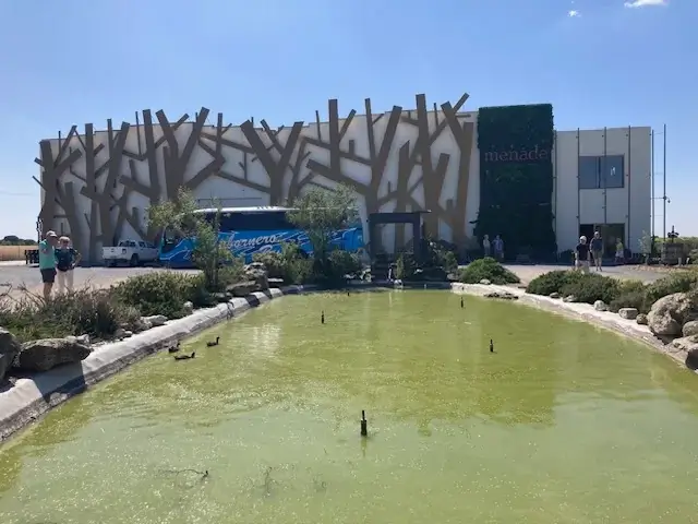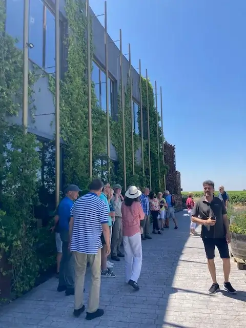 Back on the surface another couple of wines and some tortilla were produced before we boarded the coach and drove up to Menade’s fabulous modern winery with its vertical garden and stunning views across the vineyards.  A quick visit to the biodiversity garden, and a peep at the geese, hens, goat and donkeys preceded a lovely relaxed lunch of tapas and some perfectly cooked ham from Ibérico pigs.  Accompanied by a Verdejo, a Sauvignon Blanc and a Tempranillo.