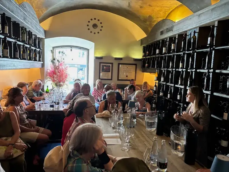 From the restaurant, we took a 100 yard walk (in quite some heat) to the tasting room of the famous Movia estate. Movia are based in Brda, next to the Italian border but have established a very successful and atmospheric tasting room right in the heart of the city. Seventh generation Ela and her boyfriend Grega hosted a terrific tasting which showcased a top class selection of wines starting with a first on a TSWT tour – a manual disgorgement of a bottle of sparkling wine in a bucket of water! Using a Movia designed disgorging tool this was an effective way of getting rid of the yeast with no risk to the general public! more Rebula, Chardonnay, Orange Rebula, Pinot Noir and culminating in a 2003 Merlot/Cabernet in magnum.
