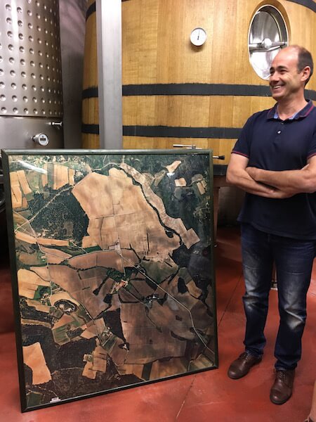 The aerial photo of the estate showed the contrast between the paler chalky soil at the top of the estate and the darker basaltic soil at the bottom – the estate is enclosed in the crater of an ancient volcano, with the Durance river to the north. Michel explained that 90% of the grapes are for rosé, these are mechanically harvested and vinified off the estate. The small winery is reserved for making two reds and two whites, all very high quality. We started thinking that this mean the rosé ends up in the general Provence rosé ocean we had been hearing about, but a taste of Chateau Baulieu rosé proved otherwise – and at €20/bottle it is far from a drop in the ocean!